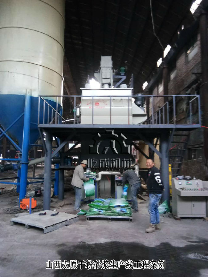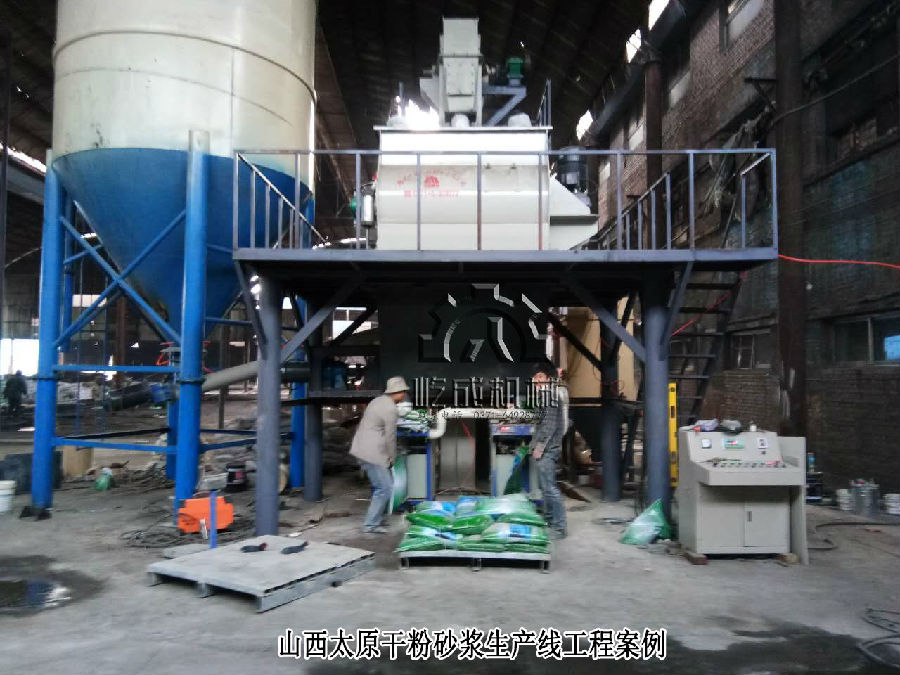 山西太原這套干混砂漿設備,類型為基礎型干混砂漿設備,主要組成包括儲料罐1臺,螺旋輸送機一臺,板鏈提升機一臺,雙軸槳葉無重力混合機以及成品倉和包裝機。