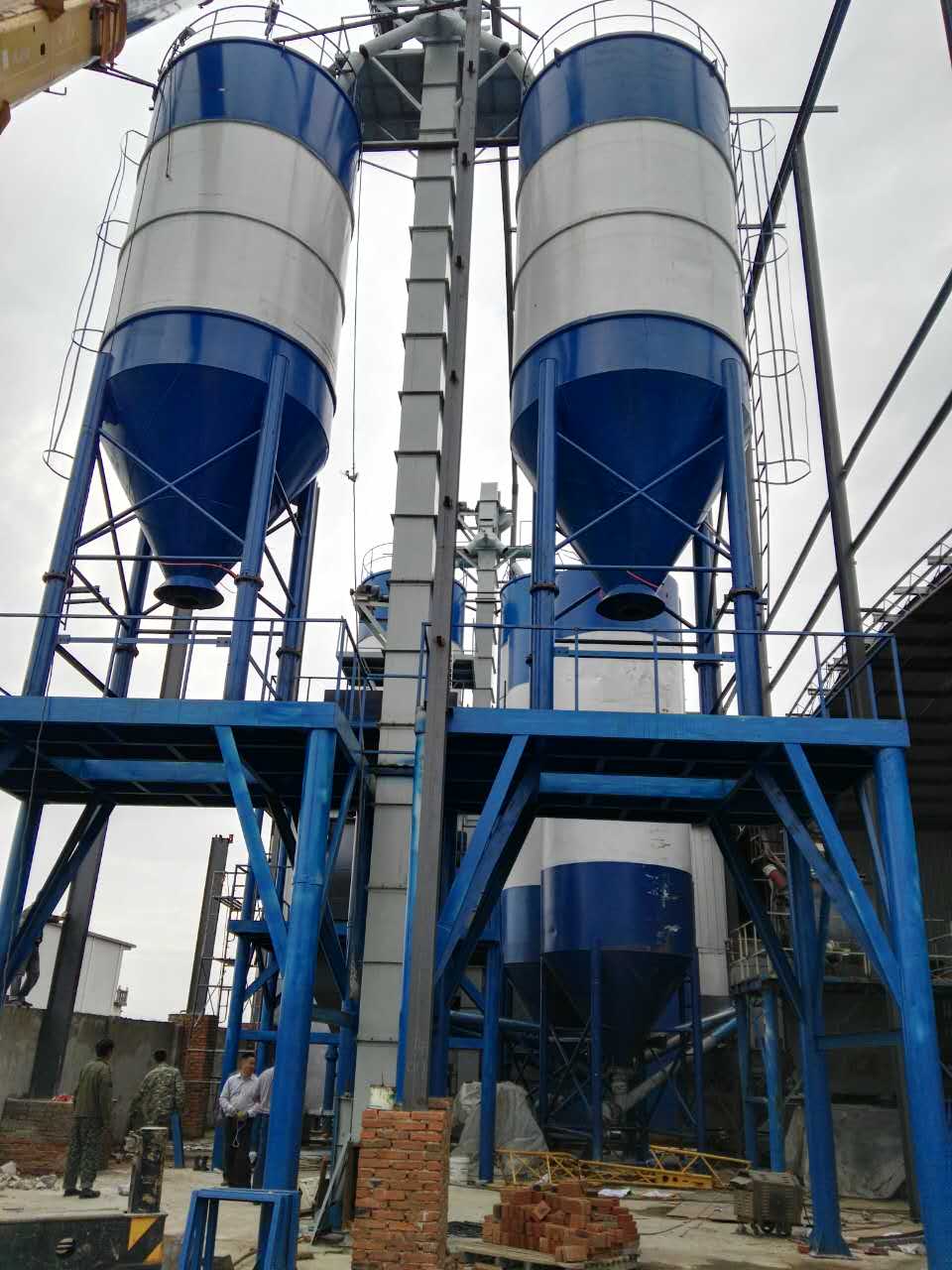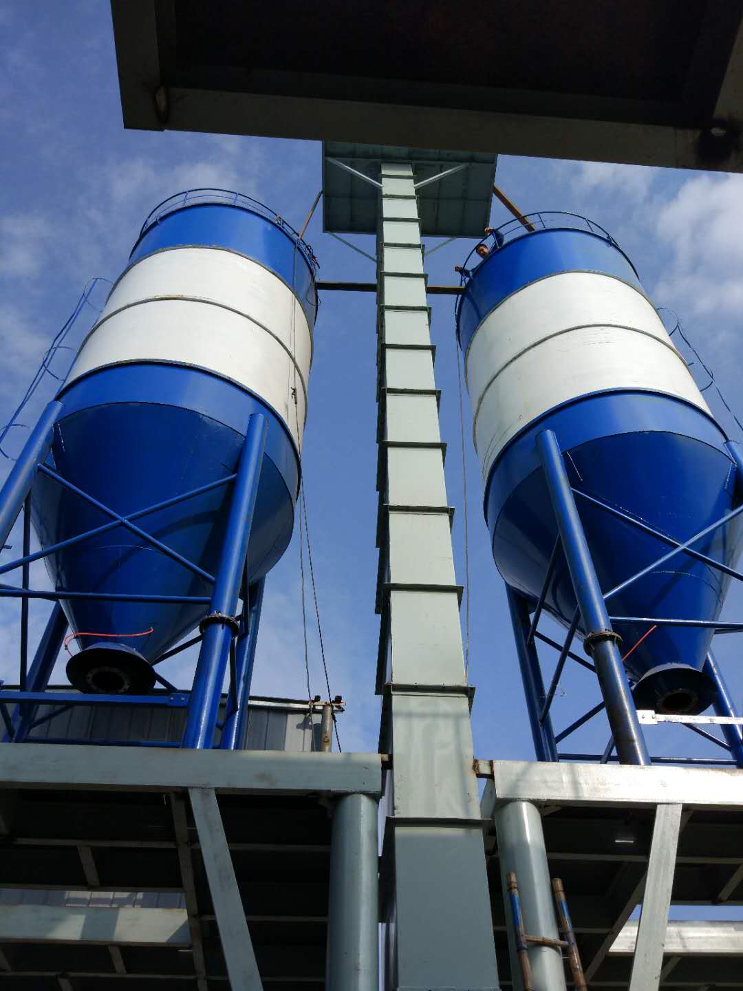 該套設(shè)備小時產(chǎn)量在8噸-10噸,是一條自動化的干混砂漿生產(chǎn)線,該設(shè)備配置有兩個原料儲料罐,用于儲存用量占比較大的原材料,如果干混砂漿中的水泥和砂、膩子粉中的重鈣、灰鈣。物料整套流程可分為儲料、運輸、計量和混合散裝。