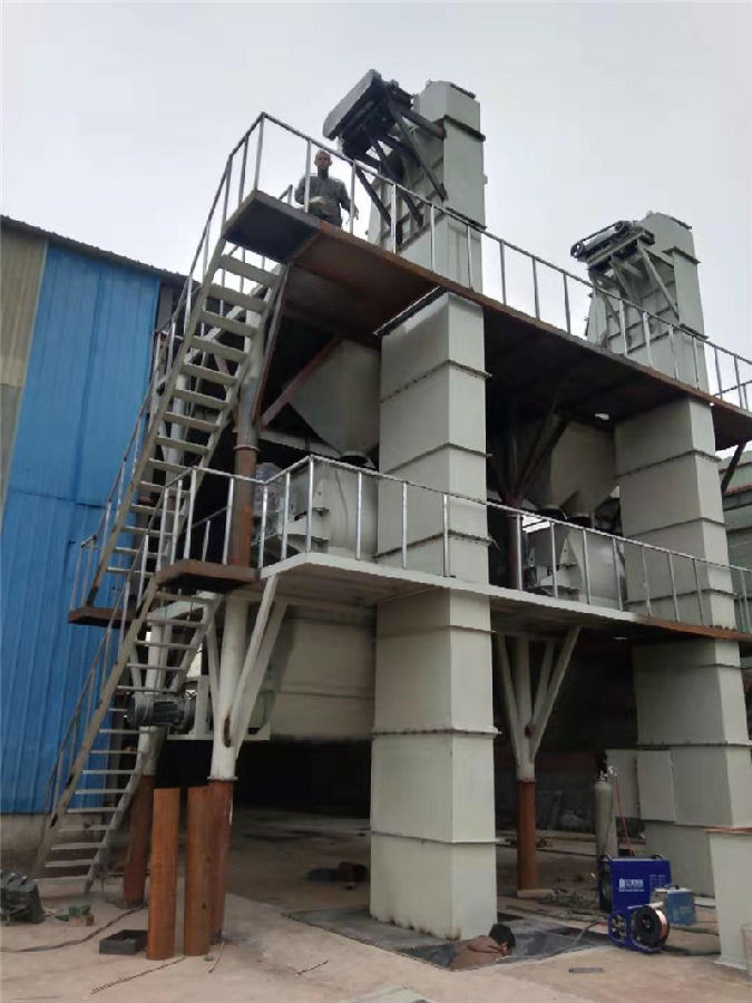 本次干混砂漿設(shè)備為雙機(jī)型生產(chǎn)線,該套設(shè)備采用連體式框架結(jié)構(gòu),框架層次分為上中下三層,自上而下的機(jī)構(gòu)中,等層設(shè)備為待混層,主要設(shè)備包括待混倉(cāng),用于預(yù)存計(jì)量 好的干混砂漿原材料。中層為混合層,主要設(shè)備為一臺(tái)3m3雙軸槳葉無重力混合機(jī),和一臺(tái)4m3雙軸槳葉無重力混合機(jī)。底層為成品層,主要設(shè)備為成品待混倉(cāng)以及包裝設(shè)備。